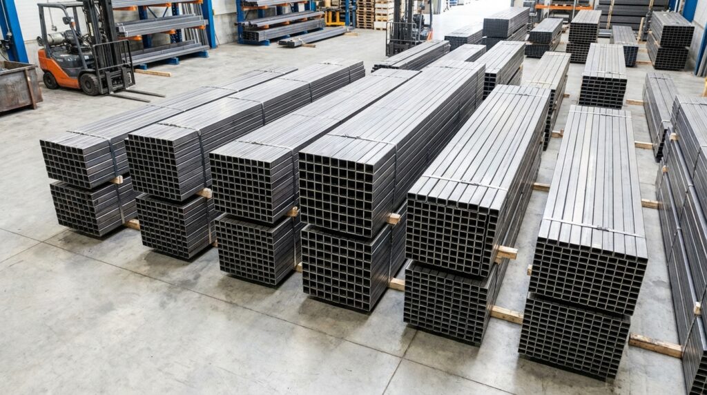 Stock includes Square, Rectangular, and Round Pipes in various grades. Essential for structural framing and heavy industrial applications.